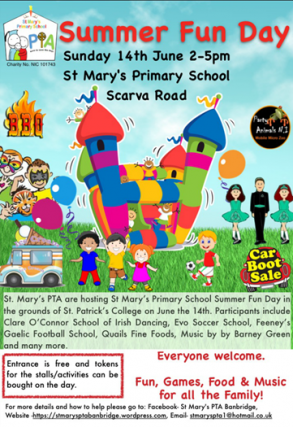 A School Funday will take place on Sunday 14 June from 2.00pm to 5.00pm. The school will be open from 1.00pm to 2.00pm to allow parents an opportunity to see the building and view our new classes. There will be lots of different activities, stalls and events; including bouncy castles, football and Gaelic mini tournaments, penalty and netball shoots, music, a Car Boot sale and lots more from 2.00pm onwards. Come along and join in the FUN!