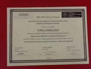 Mrs Mc Ardle and Mrs Quinn recently completed The SEN Literacy Project - Understanding Difficulties in Literacy Development: a Whole School Approach. The course, which was jointly run by Stranmillis University and St Mary's University, lasted 18 months and involved Mrs Mc Ardle and Mrs Quinn leading the in- school staff training for the Project. All teaching staff were awarded professional development certificates and Mrs Quinn received a further professional development award for her completion of the Project.