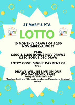 The final opportunity to join the PTA lotto will be Friday 11th December 2020 and the draw will be live